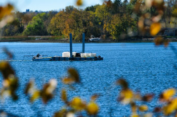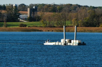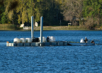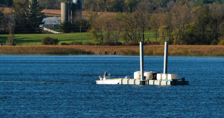 Lake Restoration finished applying 87,000 gallons of alum (aluminum sulfate) to Big Swan Lake on Tuesday. This photo was taken Monday as the final push began. The process took about two weeks while contending with several overly windy days that delayed applications. The GPS-guided treatments will be repeated early next spring or late fall.
